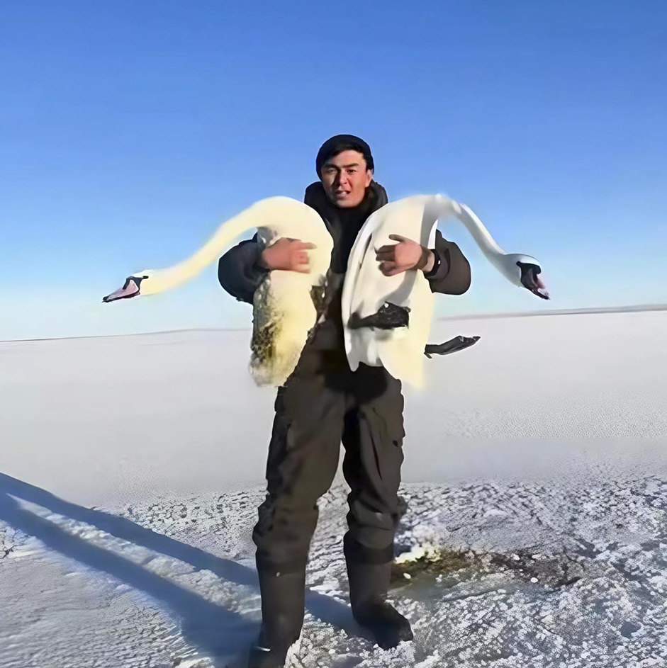 …В тот день отец и сын Жакуповы возвращались домой через озеро и заметили на льду лебедя. Удивляясь тому, почему птица до сих пор не улетела, Бауыржан решил снять ее на видео, подошел поближе и понял – перед ним уже практически обессиленный лебедь. Сначала он не давался в руки, сопротивляясь из своих последних птичьих сил, но очень скоро сдался, поникнув на руках старшего Жакупова.