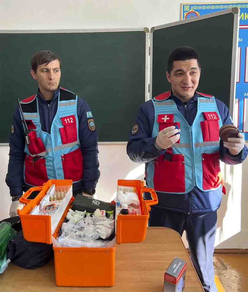 Далее мастер-класс продолжила бригада Центра медицины катастроф ДЧС, в которую входят водитель-парамедик, фельдшер, врач неотложной помощи и психолог. Врач Жан Касенов и фельдшер Алексей Степанов наглядно показали, как быстро остановить кровотечение, наложить жгуты и зафиксировать конечность при закрытом переломе.