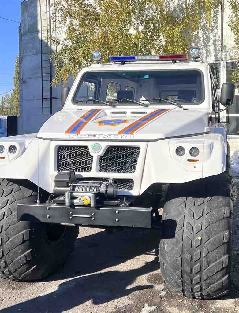 – Эта машина-вездеход – настоящий спасательный зверь. Она рассчитана на десять человек вместе с водителем. Ей нипочём снег, болото, бездорожье. Спереди установлена лебёдка на пульте управления с тягой 3,5 тонны. С её помощью машина может не только вытащить себя из сугроба, но и помочь другой технике. Во время весенних паводков в сёлах Актогайского района именно она доставляла помпы и рукава для откачки воды, перевозила инертные материалы, чтобы укрепить берега и защитить дома от подтопления. Её «сестра» – такая же машина под названием «Вея» – стоит на посту в Шидертах. Она ещё более универсальна: шестиколёсная и даже способна плавать, если установить лодочный мотор, – рассказал Александр Дехнич, главный спасатель оперативно-спасательного отряда.